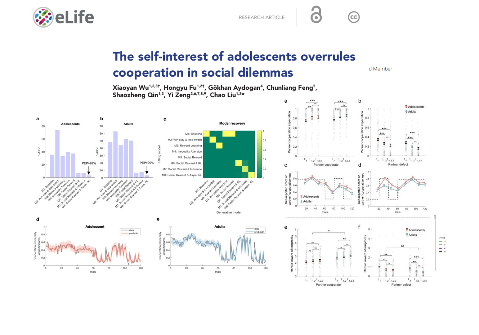 On March 31, 2026, Professor Chao Liu’s research team from the State Key Laboratory of Cognitive Neuroscience and Learning, Faculty of Psychology, Beijing Normal University, published a paper titled “The self-interest of adolescents overrules cooperation in social dilemmas” in eLife. The study investigates age-related differences in cooperation during social interactions between adolescents and adults. By integrating behavioral experiments with computational modeling, the research systematically elucidates the key psychological mechanism underlying lower cooperation levels in adolescents: adolescents are not impaired in judging others’ willingness to cooperate; rather, they assign lower intrinsic value to reciprocal cooperation and are more readily driven by self-interested motives.