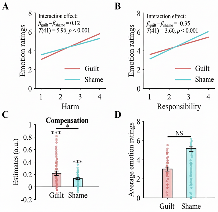 Researchers first found that both the degree of harm and the level of responsibility significantly enhanced individuals’ experiences of guilt and shame. However, finer-grained analysis revealed an asymmetry in how these cognitive factors influence emotions: the effect of harm on guilt was significantly stronger than on shame, while the effect of responsibility on shame was significantly stronger than on guilt (Figure 1). Within a unified experimental framework, these results directly validate the core prediction of functionalist theory: guilt is more sensitive to the actual harm inflicted on others, whereas shame is more sensitive to the responsibility the individual bears within the social evaluation system.